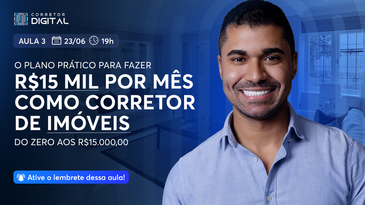 Aula inédita gratuita | Corretor Digital. Consiste em 3 episódios direto ao ponto para mostrar o modelo de negócio que eu e corretores de sucesso estão utilizando hoje para faturar alto, vendendo no mínimo 3 imóveis todos os meses e sem precisar de experiência na área.